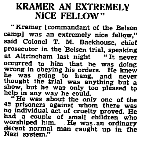 KRAMER AN EXTREMELY NICE FELLOW""Kramer [commandant of the Belsen camp] was an extremely nice fellow," said Colonel T. M. Backhouse, chief prosecutor in the Belsen trial, speaking at Altrincham last night(.) "It never occurred to him that he was doing wrong in obeying orders. He knew he was going to hang, and never thought the trial was anything but a show, but he was only too pleased to help in any way he could."He was about the only one of the 45 prisoners against whom there was no indivudal act of cruelty proved. He had a couple of small children who worshipped him. He was an ordinary decent normal man caught up in the Nazi system."The Manchester Guardian, Friday, February 22, 1946, p. 8.