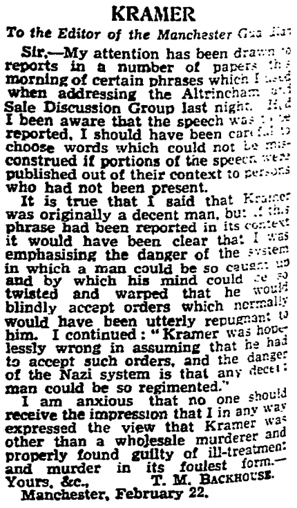 To the Editor of the Manchester GuardianSir.—My attention has been drawn to reports in a number of papers this morning of certain phrases which I used when addressing the Altrincham and Sale Discussion Group last night. Had I been aware that the speech was to be reported, I should have been careful to choose words which could not be misconstrued if portions of the speech were made published out of their context to persons who had not been present.It is true that I said that Kramer was originally a decent man, but if this phrase had been reported in its context it would have been clear that I was emphasising the danger of the system in which a man could be so caught up and by which his mind could be so twisted and warped that he would blindly accept orders which normally would have been utterly repugnant to him. I continued: "Kramer was hopelessly wrong in assuming that he had to accept such orders, and the danger of the Nazis system is that any decent man could be so regiment."I am anxious that no one should receive the impression that I in any way expressed the view that Kramer was other than a wholesale murderer and properly found guilty of ill-treatment and murder in its foulest form.—Yours, &c.,