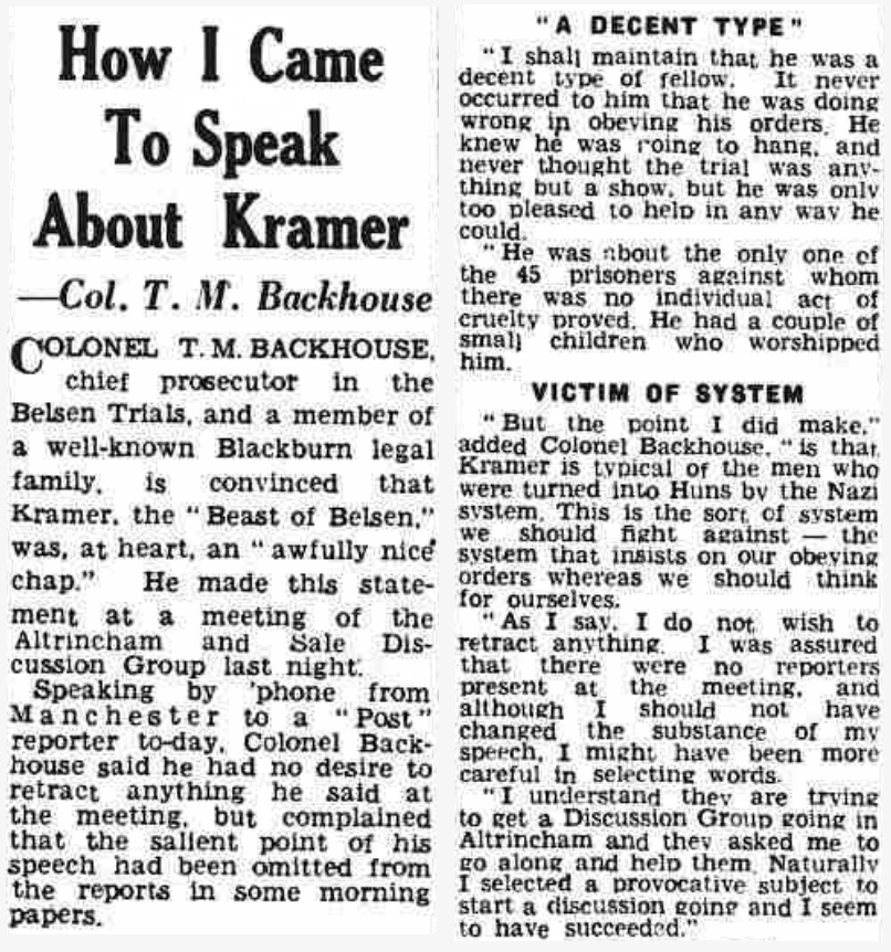How I Came To Speak About Kramer—Col. T. M. BackhouseCOLONEL T. M. BACHOUSE, chief prosecutor in the Belsen Trials, and a member of a well-known Blackburn legal family, is convinced that Kramer, the "Beast of Belsen," was, at heart, an "awfully nice chap." He made this statement at a meeting of the Altrincham and Sale Discussion Group last night.Speaking by phone from Manchester to-day, Colonel Backhouse said he had no desire to retract anything he said at the meeting, but complained that the salient point of his speech had been omitted from the reports in some morning papers."A DECENT TYPE""I shall maintain that he was a decent type of fellow. It never occurred to him that he was doing wrong in obeying his orders. He knew he was going to hand, and never thought the trial was anything but a show, but he was only too pleased to help in any way he could."He was about the only one of the 45 prisoners against whom there was no individual act of cruelty proved. He had a couple of small children who worshipped him.VICTIM OF SYSTEM"But the point I did make," added Colonel Bachhouse, "is that Kramer is typical of the men who were turned into Huns by the Nazi system. This is the sort of system we should fight against — the system that insists on our obeying orders whereas we should think for ourselves."As I say. I do not wish to retract anything. I was assured that there were no reporters present at the meeting, and although I should not have changed the substance of my speech, I might have been more careful in selecting words."I understand they are trying to get a Discussion Group going in Altrincham and they asked me to go along and help them. Naturally I selected a provocative subject to start a discussion and I seem to have succeeded.The Lancashire Daily Post, Friday, February 22, 1946, p. 4.