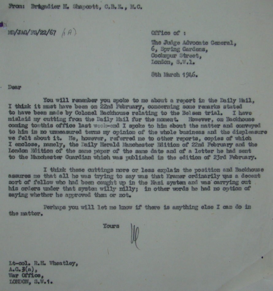 8th March 1946.Dear [Lt-col. R.H. Wheatley]You will remember you spoke to me about a report in the Daily Mail, I think it must have been on 22nd February, concerning some remarks stated to have been made by Colonel Backhouse relating to the Belsen trial. I have mislaid my cutting from the Daily Mail for the moment. However, on Backhouse coming to this office last week-end I spoke to him about the matter and conveyed to him in no unmeasured terms my opinion of the whole business and the displeasure we felt about it. He, however, referred me to other reports, copies of which I enclose, namely, the Daily Herald Manchester Edition of 22nd February and the London Edition of the same paper of the sane date[*] and of a letter he had sent to the Manchester Guardian which was published in the edition of 23rd February.I think these cuttings more or lees explain the position and Backhouse assures me that all he was trying to say was that Kramer ordinarily was a decent sort of fellow who had been caught up in the Nazi system and was carrying out his orders under that system willy nilly; in other words he had no option of saying whether he approved them or not.Perhaps you will let me know if there is anything else I can do in the matter.YoursLt-col. R.H. Wheatley,