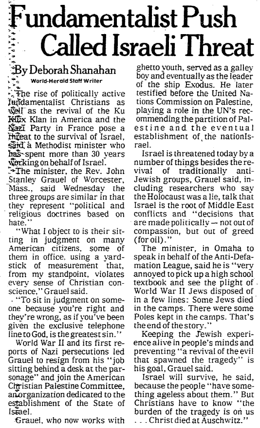 I'd not previously heard of Methodist minister John Stanley Grauel, but his Zionist curriculum vitae certainly puts those of all but a few Jewish nationalists to shame. Aside from supporting all things Zionism; being allowed to speak on behalf of the ADL, Christian minister Grauel was of the opinion that "Christ died at Auschwitz."