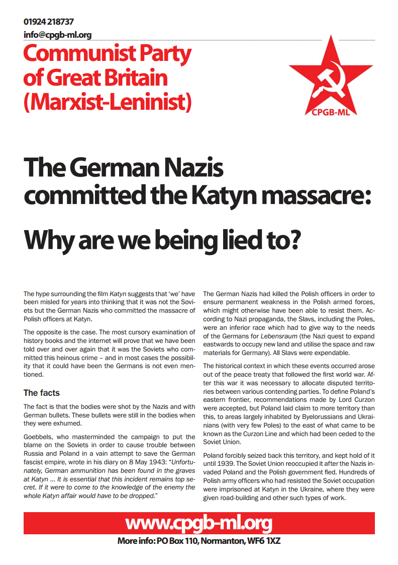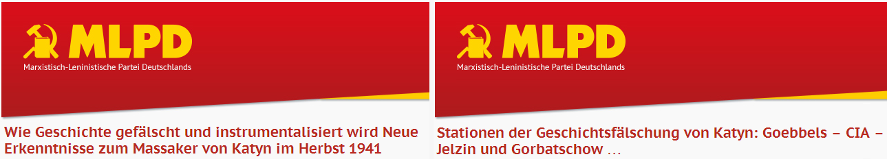 The British communists aren't alone in denying the Soviets perpetrated the massacre at Katyn, their comrades in Germany are also at it. The headlines above appeared in articles published in 2011 (left and right), in the one on the left they also feature the dishonestly clipped quotation from Goebbels' diary entry of May 8, 1943 as "evidence" of German guilt. Although, to be fair, the German communists later admitted they'd quoted Goebbels' diary out-of-context—blaming the error on a French communist. But they still maintain the Nazis committed the massacre, even if Goebbels' diaries only prove that: A. Goebbels was lying to himself in his diary, or, B. Goebbels wasn't in on the conspiracy!