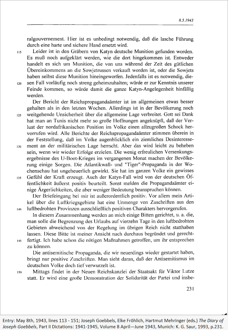 I decided to visit the library and get a copy of Goebbels' diary entry of May 8, 1943. The applicable part cited by the Katyn deniers reads: