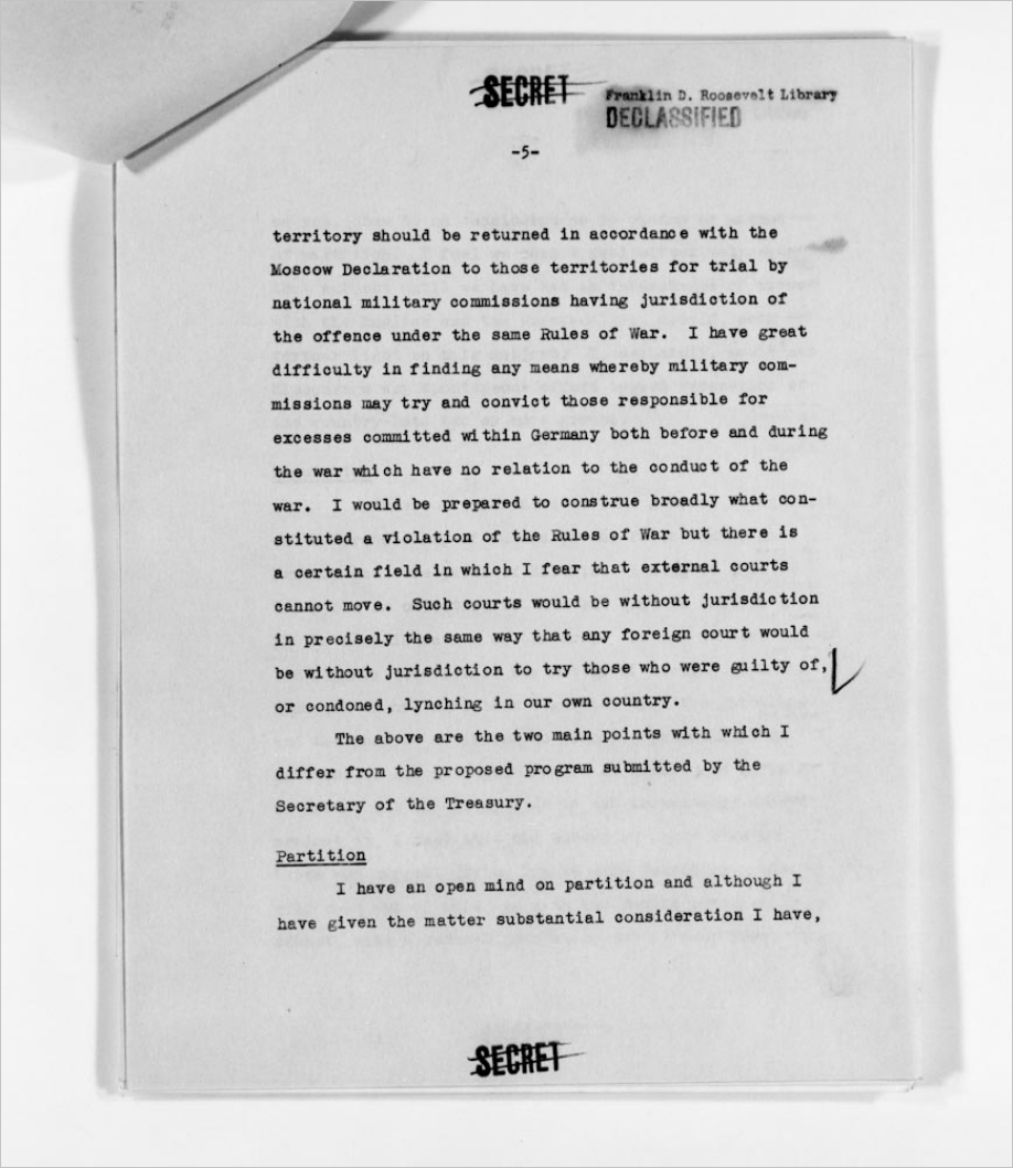 "This area should not only be stripped of all presently existing industries but so weakened and controlled that it cannot in the foreseeable future become an industrial area—all industrial plants and equipment not destroyed by military action shall either be completely dismantled or removed from the area or completely destroyed, all equipment shall be removed from the mines and the mines shall be thoroughly wrecked."I am unalterably opposed to such a program for the reasons given in my memorandum dated September 5 which is already before the President. I do not think that the reasons there stated need again be elaborated. In substance, my point is that these resources constitute a natural and necessary asset for the productivity of Europe. In a period when the world is suffering from destruction and from want of production, the concept of the total obliteration of these values is to my mind wholly wrong. My insistence is that these assets be conserved and made available for the benefit of the whole of Europe, including particularly Great Britain. The in internationalization of the Ruhr or the trusteeship of its products—I am not prepared at the moment to discuss details of method—constitutes a treatment of the problem in accord with the needs and interests of the world. To argue that we are incapable of sustained effort to control such wealth within proper channels is to destroy any hope for the future of the world. I believe that the education furnished us by the Germans in two world wars, plus the continuity of interest which such a trusteeship would stimulate is sufficient insurance that we can be trusted to deal with the problem. The unnatural destruction of this industry would, on the other hand, be so certain, in my judgment, to provoke sympathy for the Germans that we would create friends both in this country and abroad for the Germans, whereas now most of the peoples of the world are thoroughly antipathetic to them.The other fundamental point upon which I feel we differ is the matter of the trial and punishment of those Germans who are responsible for crimes and depredations. Under the plan proposed by Mr. Morgenthau, the so-called arch-criminals shall be put to death by the military without provision for any trial and upon mere identification after apprehension. The method of dealing with these and other criminals requires careful thought and a well-defined procedure. Such procedure must embody, in my judgment, at least the rudimentary aspects of the Bill of Rights, namely, notification to the accused of the charge, the right to be heard and, within reasonable limits, to call witnesses in his defense. I do not mean to favor the institution of state trials or to introduce any cumbersome machinery but the very punishment of these men in a dignified manner consistent with the advance of civilization, will have all the greater effect upon posterity. Furthermore, it will afford the most effective way of making a record of the Allies to terminate the system and prevent its recurrence.I am disposed to believe that at least as to the chief Nazi officials, we should participate in an international tribunal constituted to try them. They should be charged with offences against the laws of the rules of ear in that they have committed wanton and unnecessary cruelties in connection with the prosecution of the war. This law of the Rules of War has been upheld by our own Supreme Court and will be the basis of judicial action against the Nazis.Even though these offences have not been committed against our troops, I feel the that our moral position is better if we take our share in their conviction. Other war criminals who have committed crimes in subjugated territory should be returned in accordance with the Moscow Declaration to those territories for trial by national military commissions having jurisdiction of the offence under the same Rules of War. I have great difficulty in finding any means whereby military commissions may try and convict those responsible for excesses committed within Germany both before and during the war which have no relation to the conduct of the war. I would be prepared to construe broadly what constituted a violation of the Rules of War but there is a certain field in which I fear that external courts cannot move. Such courts would be without jurisdiction in precisely the same way that any foreign court would be without jurisdiction to try those who were guilty of, or condoned, lynching in our own country.The above are the two main points with which I differ from the proposed program submitted by the Secretary of the Treasury.
