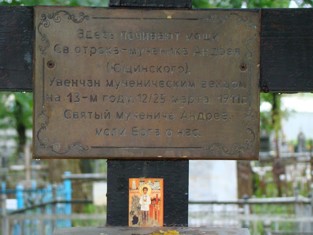Here lie the relics ofYoung-martyr St. Andrew(Yushchinsky).Enwreathed with the crown of martyrdomaged 13-years, between 12/25 March 1911.Saint Martyr Andrew.Pray to God for us.