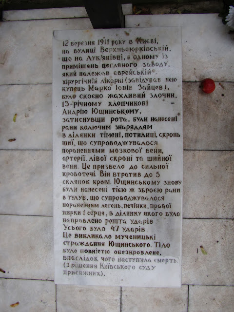 "March 12, 1911 in Kiev, in Lukyanivka on Verkhne-Yurkovsky Street, in one of the brick factory buildings that belonged to the Jewish Surgical Hospital (in the management of merchant Marco Ion Zaitsev), a terrible crime was committed. 13-year-old Andrew Yushchinsky was gagged at the mouth and wounds were inflicted on the forehead, back of the head, the temples, and neck with a barbed instrument, accompanied by wounds to the cerebral veins and arteries on the left temple and cervical veins. This led to heavy bleeding. He lost up to five glasses of blood. With the same weapon wounds were again inflicted on Yushchinsky's body, accompanying injuries to the lungs, liver,right kidney and—the area to which the last blows were directed—the heart. There were 47 blows. This caused Yushchinsky's martyrdom of agony. The body was fully bled white, and as a result death ensued. (From the verdict of the Kiev court jury)"