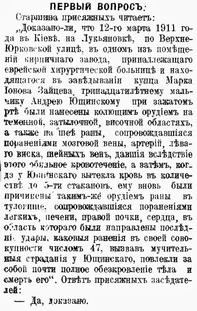 Старшина присяжных читает:«Доказано ли, что 12-го марта 1911 года в Киеве, на Лукьяновке, по Верхне-Юрковской улице, в одном из помещений кирпичного завода, принадлежащего еврейской хирургической больнице и находящегося в заведывании купца Марка Ионова Зайцева, тринадцатилетнему мальчику Андрею Ющинскому при зажатом рте были нанесены колющим орудием на теменной, затылочной, височной областях, а также на шее раны, сопровождавшиеся поранениями мозговой вены, артерий, левого виска, шейных вен, давшие вследствие этого обильное кровотечение, а затем, когда у Ющинского вытекла кровь в количестве до 5-ти стаканов, ему вновь были причинены таким же орудием раны в туловище, сопровождавшиеся поранениями легких, печени, правой почки, сердца, в область которого были направлены последние удары, каковые ранения в своей совокупности числом 47, вызвав мучительные страдания у Ющинского, повлекли за собой почти полное обескровление тела и смерть его».Ответ присяжных заседателей:— Да, доказано.