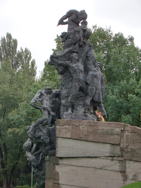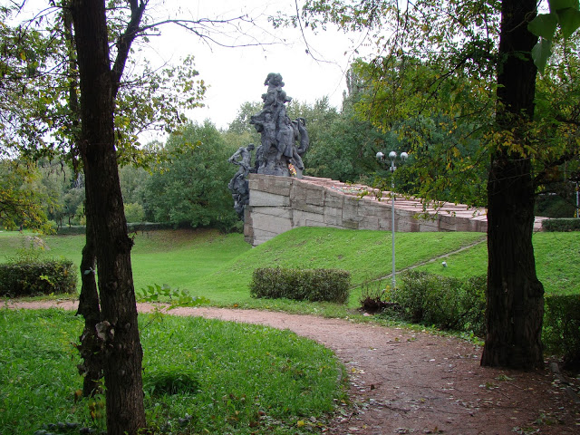 The two photos above are of the Soviet memorial designed by Anatoly Ignashchenko which was unveiled in July 1976. The statue is just one of several memorials situated in Babi Yar to the alleged murder of up to 200,000 people by the Germans and their cohorts at the site (I photographed others not mentioned here), some Jewish, some Christian, some neither—including this one. At the foot of this statue are three plaques installed in 1991; in Ukrainian, Russian and Yiddish, which read: "Here, in 1941–1943, more than one hundred thousand citizens of the city of Kyiv and prisoners of war were shot by German Fascist invaders."
