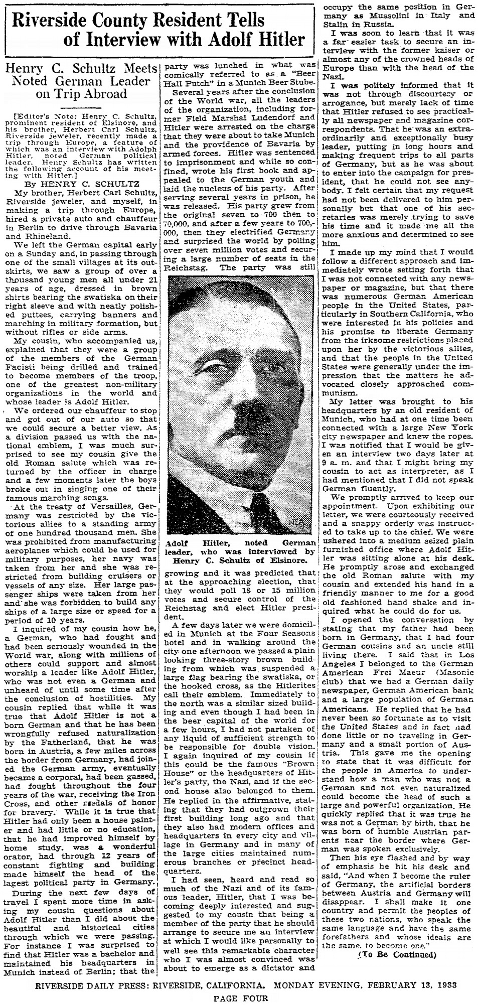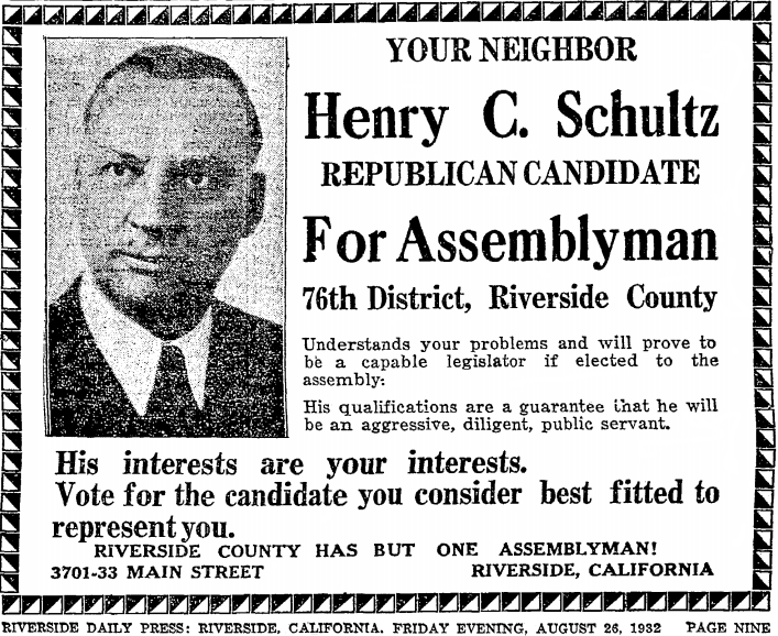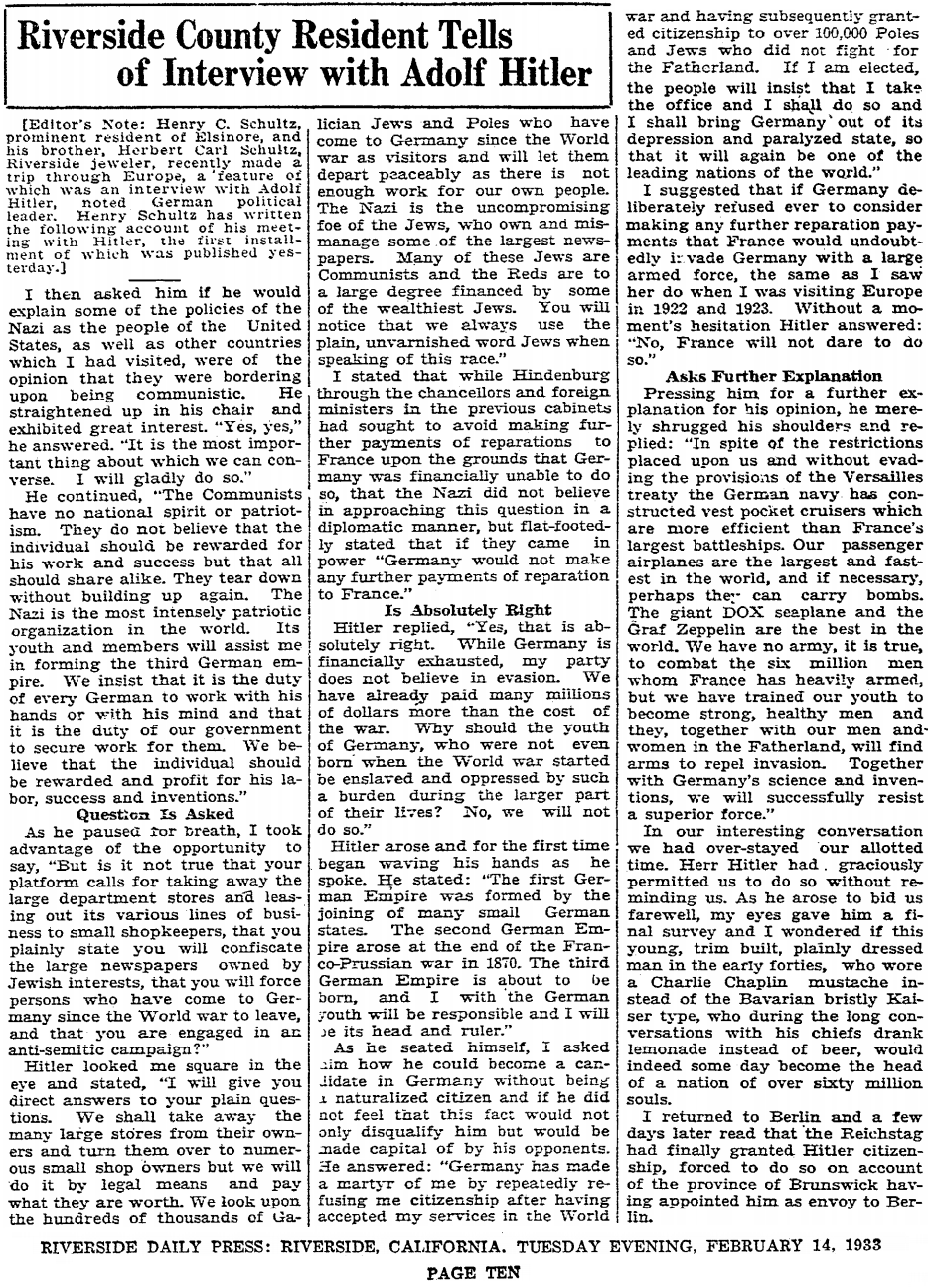 Wealthy property magnate Henry C. Schultz probably failed in this campaign to be elected to the Californian State Assembly, because he ended-up travelling in Europe during part of 1942 and 1943. Whilst visiting his ancestral home, Germany, he managed to arrange a meeting where he would interview Adolf Hitler.