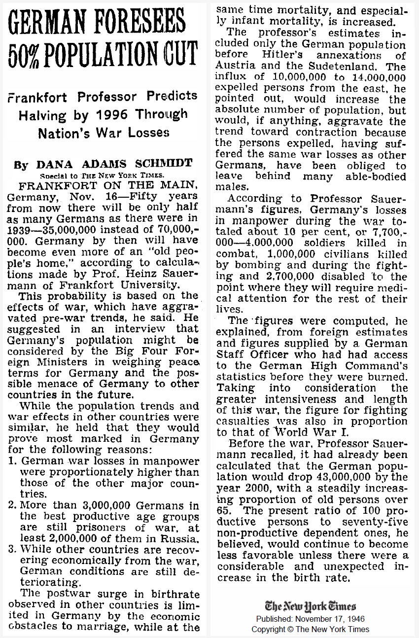 I've no idea how accurate this 1946 prediction turned out to be, but it includes some interesting details of German losses during WW2, German POWs still held captive one-and-a-half years after the war, and Germans ethnically cleansed from Eastern Europe.