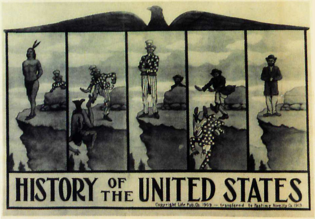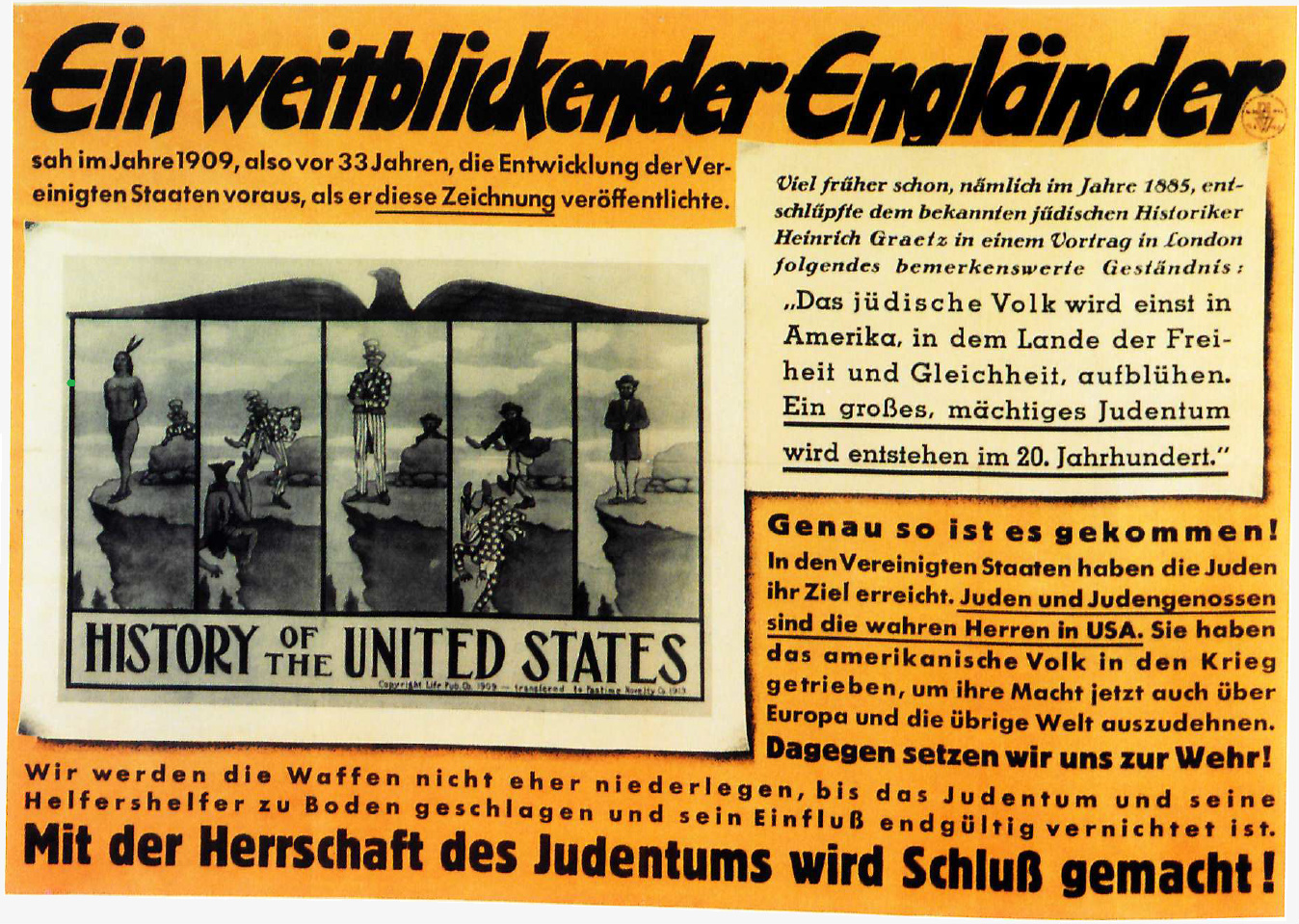 "Reproduces a 1909 drawing labeled,”History of the United States,” showing a Native American Indian being pushed off a cliff by Uncle Sam, who is in turn supplanted by a Jew. The poster declares that the Jews are the true masters in the United States, and pledges to fight until the Jews are overcome: “They have driven the American people into war to take over Europe and to rule rest of the world. We will defend ourselves against them! We will not lay down our weapons until we get rid of the Jews and destroy their influence completely. We will put an end to the reign of the Jews!”"