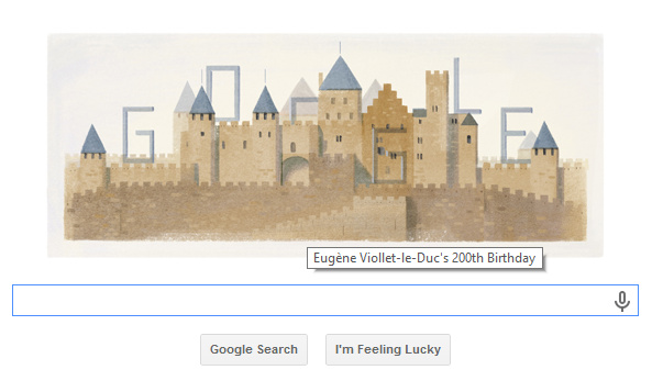 With today being Holocaust day, you might have thought that Google would have chosen to commemorate it on their Google doodle, but you'd be mistaken, as today Google chose instead to celebrate the bicentenary of the birth of French architect Eugène Viollet-le-Duc who is perhaps most famous—outside of France anyway—for his renovation (1845 - c.1865) of the Notre Dame de Paris (Our Lady of Paris) cathedral with its renown gargoyles and chimeras.