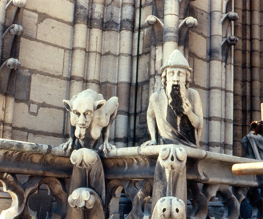 Of the 54 chimeras which grace the cathedral Viollet-le-Du created only one depiction of an actual human figure: the mythical "Wandering Jew," although it's incorrectly claimed to be "the alchemist" by neo-pagan types. The the late British professor of art Michael Camille in his study The Gargoyles of Notre-Dame states that Viollet-le-Du created a highly sympathetic portrayal of the Wandering Jew—minus his usual money-bag and scowl—and that the sympathetic view of Jew cursed to endlessly walk the Earth was common theme in the arts of mid-nineteenth century France due mostly to the popular novel Le Juif errant by Eugène Sue. Which, essentially, cast the Jesuits as the bad guys. According to Camile, being caught reading the novel would have had a Catholic excommunicated and its author was exiled from France.