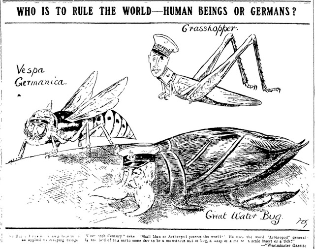 Sir Harry Johnson ... [indecipherable] in "Ninethenth Century" asks "Shall Man or Arthropod possess the world?" He uses the word ''Arthropod" generally as applied to creeping things. "Is the lord of this earth some day to be a monstrous ant or bug, a wasp or a midge, a scale-insect or a tick?"