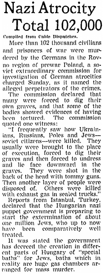 "Reports from Istanbul, Turkey, declared that the Hungarian nazi puppet government is preparing to start the extermination of about one million Jews, who up to now have been comparatively well treated.