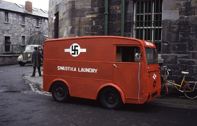The Nazis in the cartoon appear to be driving a van belonging to the Irish Swastika Laundry company.
