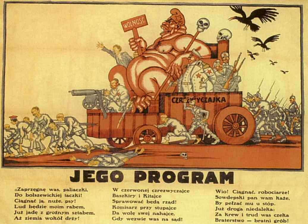 This is a 1920 anti-Bolshevism poster produce by the Polish government during the Polish-Soviet war. The sign held by the Bolshevik monster says 'Wolnsoc' (Freedom) and on the side of his carriage is the word 'czrezwyczajka' which is an abbreviation for 'The All-Russian Emergency Commission for Combating Counter-Revolution and Sabotage,' more commonly known as the Cheka.
