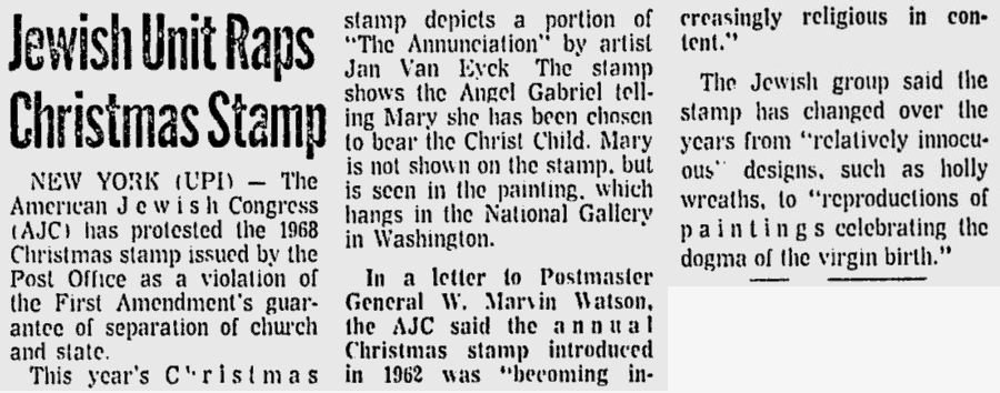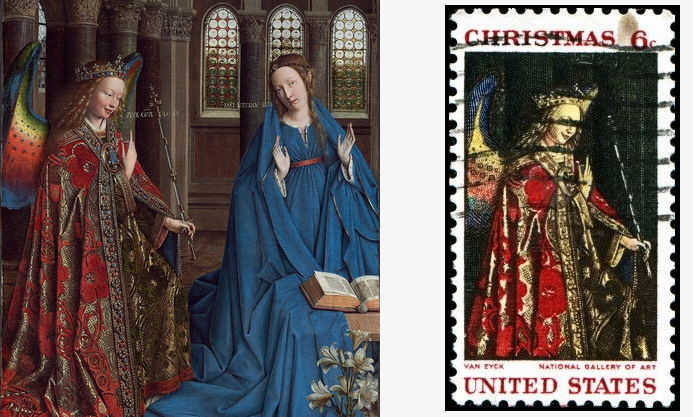 A portion of Jan van Eyck's stunning 15th century painting the Annunciation, depicting the Angel Gabriel informing the Virgin Mary that she will give birth to the Son of God, next to the United States Postal Service's Christmas 1968 stamp which reproduced only the Angel Gabriel from Eyck's painting.