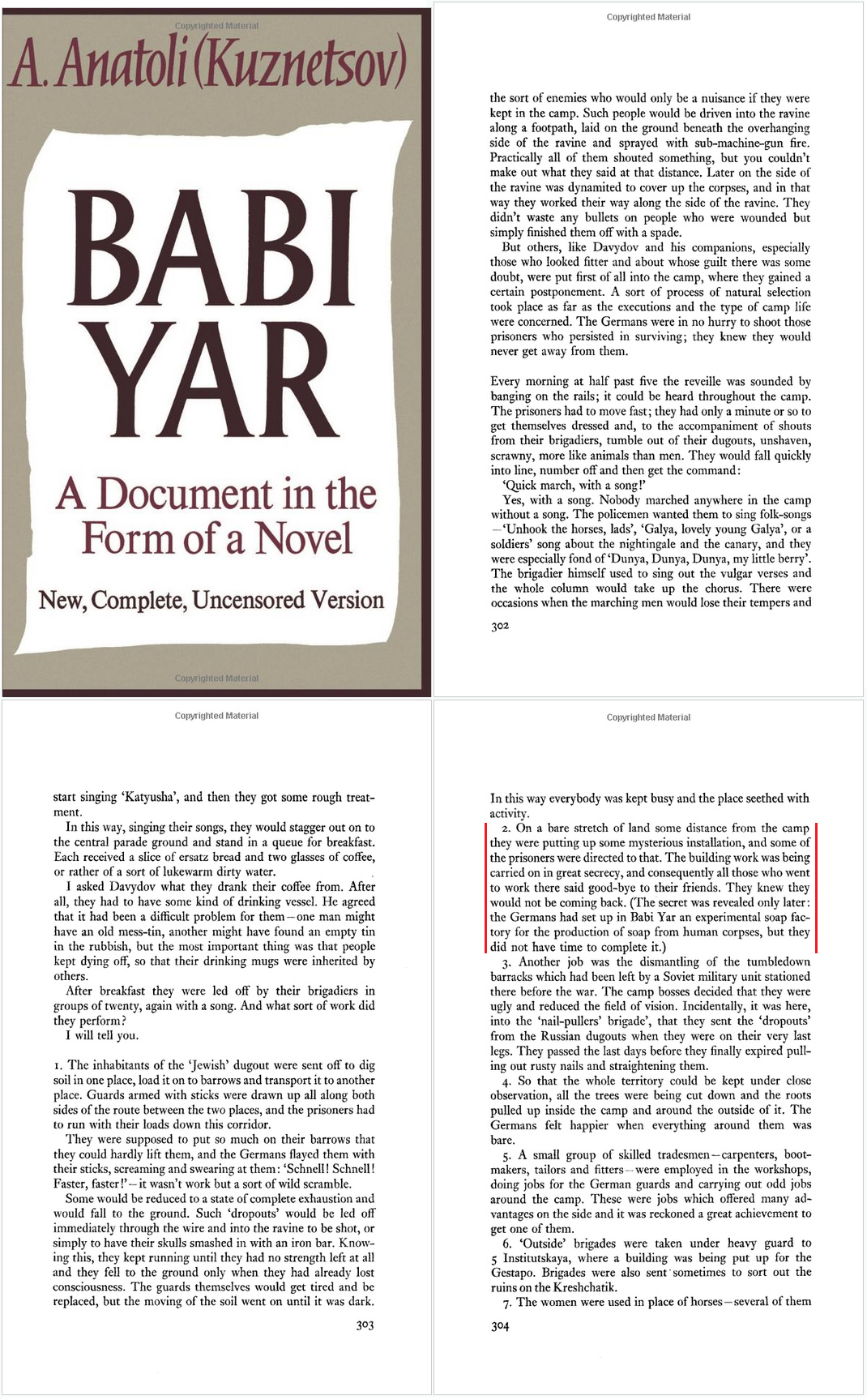 A. Anatoli (Kuznetsov), Babi Yar: A Document in the Form of a Novel, New Complete Uncensored Version, New York:  Farrar, Straus and Giroux, 1970, p.304.