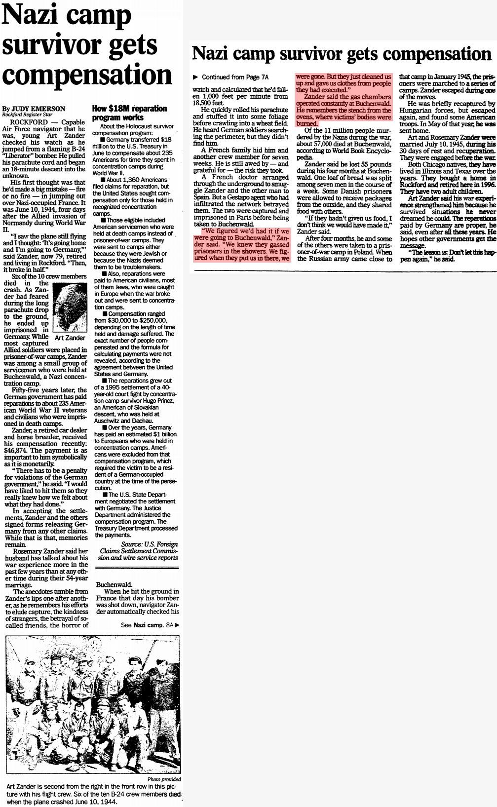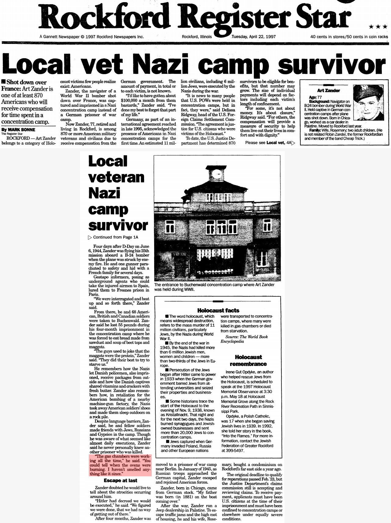 "We figured we'd had it if we were going to Buchenwald," Zander said. "We knew they gassed prisoners in the showers. We figured when they put us in there, we were gone. But they just cleaned us up and gave us clothes from people they had just executed."