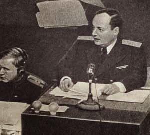 The October 6, 1945, indictment of the main Nuremberg trial charges Herman Goering and several of the other defendants with having committed the Katyn massacre. On February 14, 1946, Soviet prosecutor Colonel Yury Pokrovsky read to the court brief excerpts from the January 1944 fraudulent Soviet report: "The Truth About Katyn: Report of Special Commission for Ascertaining and Investigating the Circumstances of the Shooting of Polish Officer Prisoners by the German-Fascist Invaders in the Katyn Forest," which states that the Poles were massacred by the Wehrmacht Staff 537, Engineer Construction Battalion, commanded by Oberleutnant Arnes (recte: Ahrens), and his colleagues Oberleutnant Rex and Lieutenant Hott. And that—as far as the Soviets were concerned—was the end of the matter; they had adequately proven that the Germans had committed the massacre to the standard of evidence required by the tribunal, which was: the court took judicial notice of any report submitted by the the U.S., U.S.S.R., Britain, or France under Article 21 of the tribunal's charter.