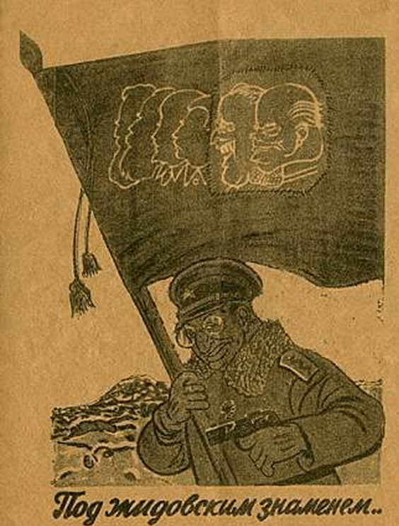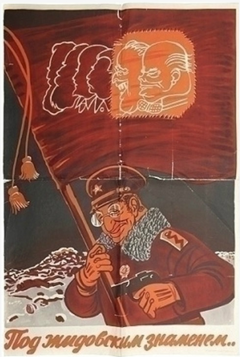 German WW2 poster in Russian reads:  Под жидовским знаменем, which translates as Under the Jewish Flag (or Banner)