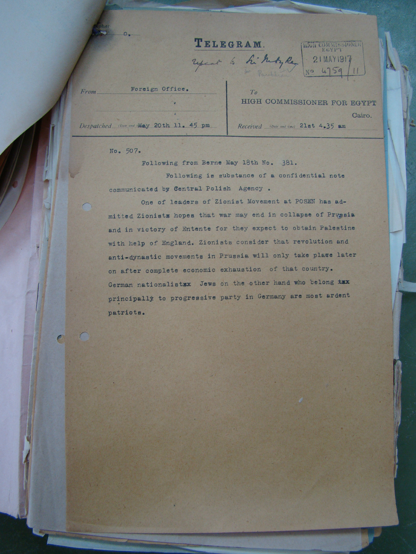 Below is a rather interesting May 20th, 1917 telegram from the Foreign Office in London to the High Commissioner of Egypt (found in file FO 141/805/1 in The National Archives), which reveals what Zionists believed was possible, not just for Zionism, but also communism, if Germany lost the war and her economy totally collapsed.