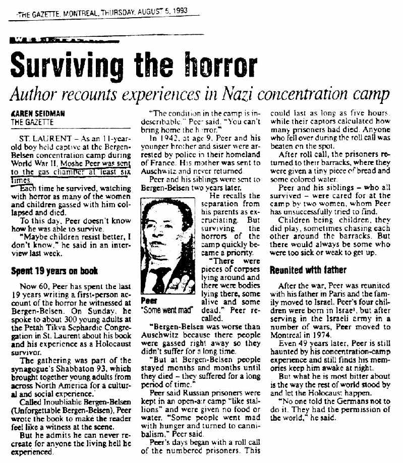 Moshe Peer, who was a boy of nine in 1942 when he was sent to Bergen-Belsen. He also states cannibalism happened there. (He also claims to have survived six gas chambers, in a camp with zero gas chambers):