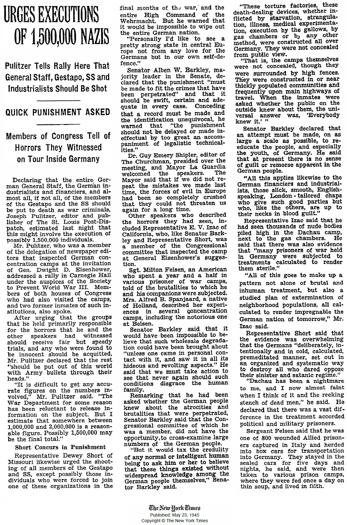 2. "Urges Executions of 1,500,000 Nazis," The New York Times, May 23, 1945. online archive ; facsimile.