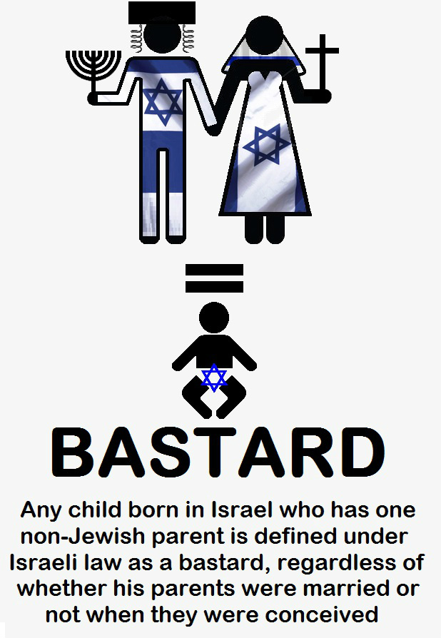 " ... in Israel, where rabbinical law rules the personal status of Jewish citizens, with the result that no Jew can marry a non-Jew; marriages concluded abroad are recognized, but children of mixed marriages are legally bastards (children of Jewish parentage born out of wed-lock are legitimate), and if one happens to have a non-Jewish mother he can neither be married nor buried."