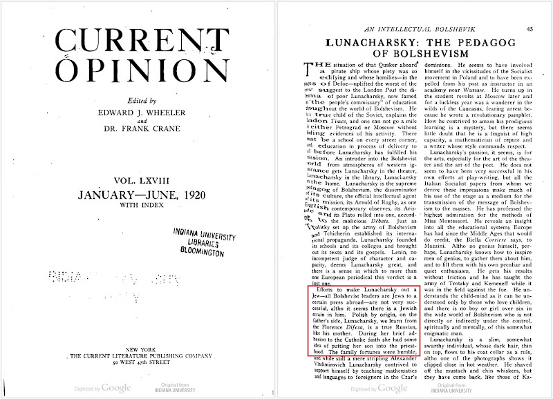 Efforts to make Lunacharsky out a Jew — all Bolshevist leaders are Jews to a certain press abroad — are not very successful, altho it seems there is a Jewish 'strain in him. Polish by origin, on the father's side, Lunacharsky, we learn from the Florence Difesa, is a true Russian, like his mother. During her brief adhesion to the Catholic faith she had some idea of putting her son into the priesthood. 1