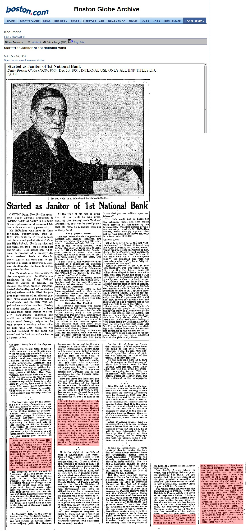 Louis Thomas McFadden (1876-1936) was a legendary