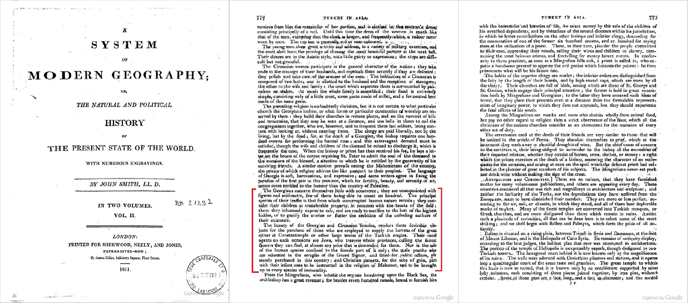 The beauty of the Georgian and Circassian females, renders them desirable objects for the purchase of those who are employed to supply the harems of the great either at Constantinople or other large towns of the Turkish empire. Their usual agents on such occasions are Jews, who traverse whole provinces, culling the fairest flowers they can find, at almost any price that is demanded for them. Nor is the sale of the human species confined to the female part of it only; the male youths who are educated in the seragilo of the Grand Signor, and fitted-for public offices, are mostly puchased in this country; and Christian parents, for the sake of gain, part with their infant sons to be instructed in the religion of Mahomet, and to be brought up in every species of immorality."