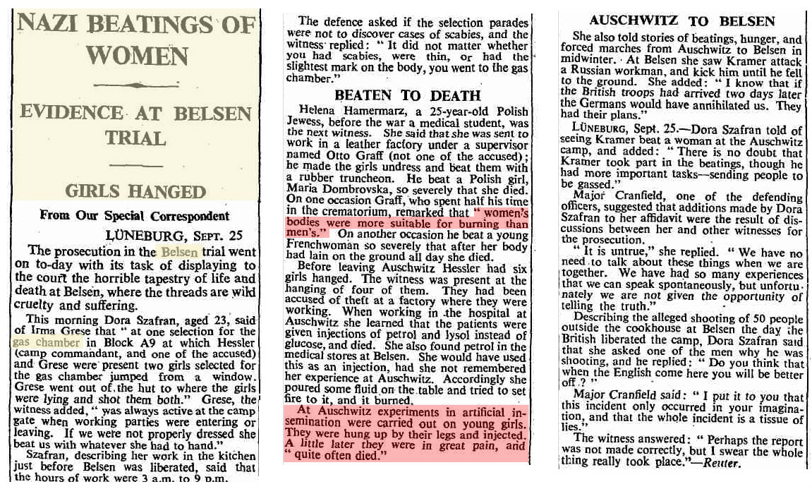 She claimed under oath at the first Belsen trial, that the Nazis hung young girls up