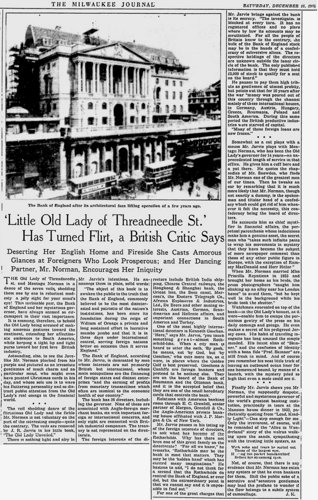 Mr. Jarvie pauses in his toting up of foreign interests of directors, to ask what has become of the Rothschilds. Why has there not been one of this great family on the directorate? "For all we know," he remarks, "Rothschilds may be the bank in most that matters. They may be the 'hidden hand' which has excited many imaginations." He hastens to add, "I do not think for a second that the Rothschilds do control the Bank of England, or ever did, but the extraordinary point is that we cannot say and it is impossible to find out."