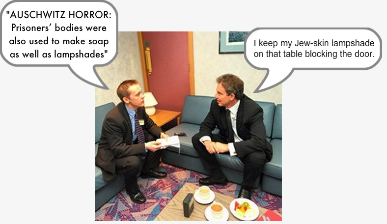 This is a photo of British journalist Paul Broster interviewing British Prime Minister Tony Blair in the late 1990s. Broster is now also a lecture on journalism at Manchester University. He claimed in 2004, in a major British newspaper, that the Nazis made Jews into soap and lampshades at Auschwitz.