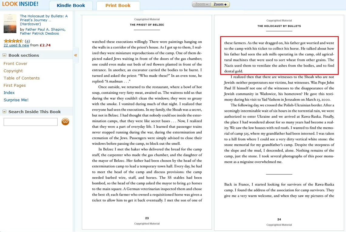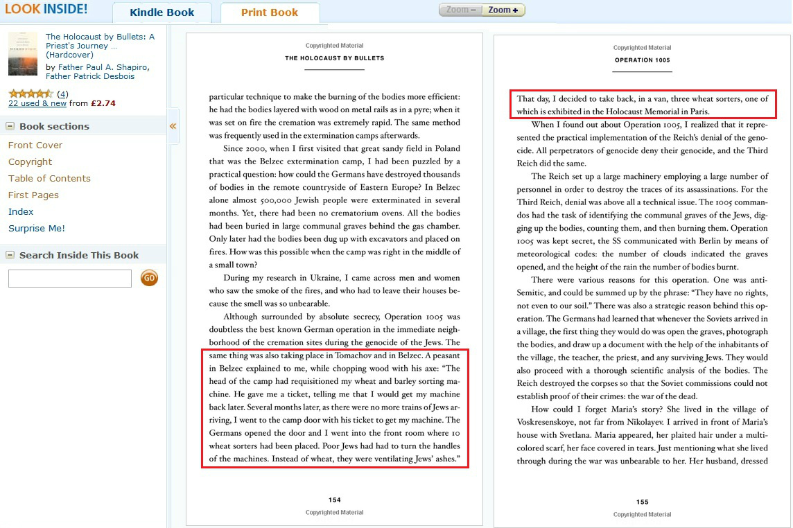 Not mentioned by HC is the one on pages 23/4, when the son of a farmer told Desbois a story of the Nazis requisitioning his father's horse, his father later going up to Belzec death camp to get his horse back, (and presumably being let in to the inner part of the camp) where he witnesses wheat and barley sorting machines being used to "ventilate the ashes" of cremated Jews "to find dental gold."