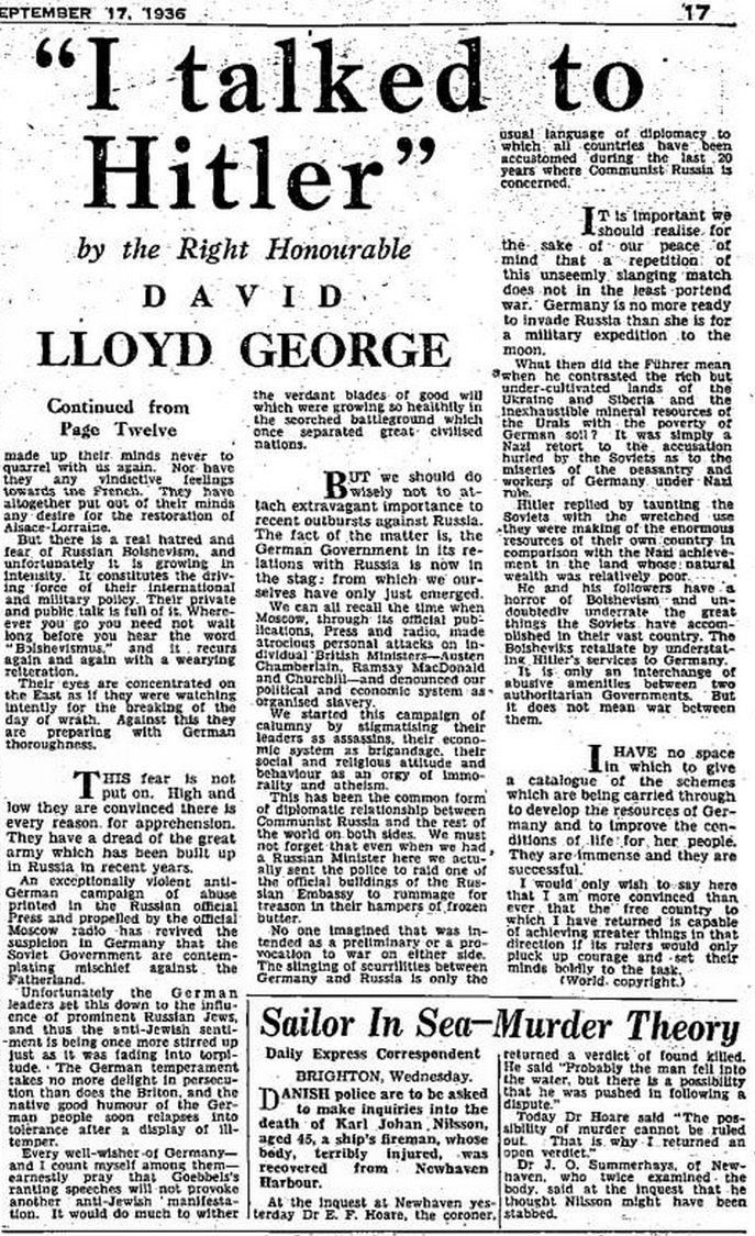 He and his followed have a horror of Bolshevism and undoubtedly underrate the great things the Soviet have accomplished in their vast country. The Bolsheviks retaliate by understating Hitler's services to Germany. It is only an interchange of abusive amenilies between two authoritarian Governments. But it does not mean war between them.