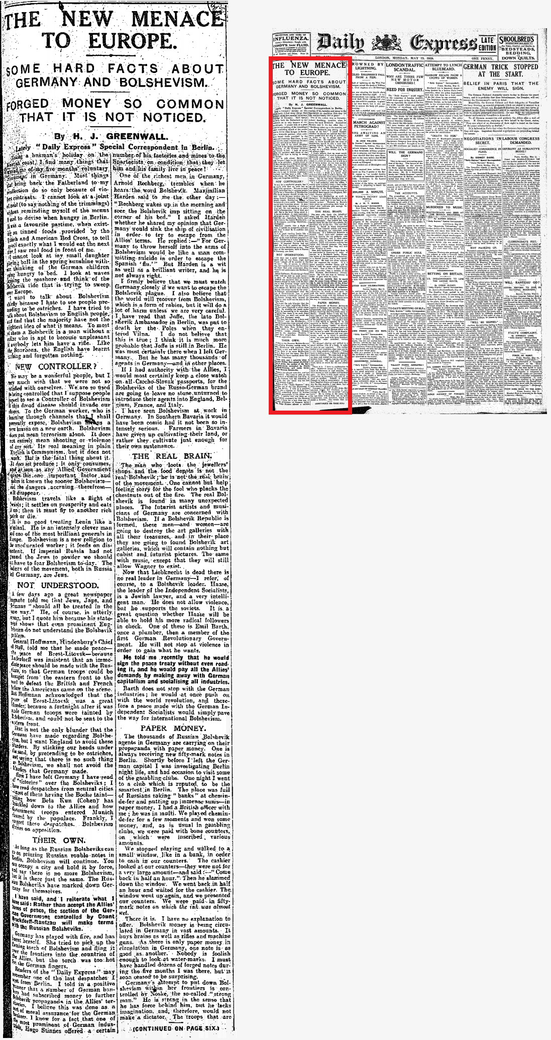 "Bolshevism is a new religion to the uneducated worker; it feeds on discontent. If imperial Russia had not ground the Jews to powder we should not have to fear Bolshevism to-day. The leaders of the movement in Russia and Germany, are Jews."