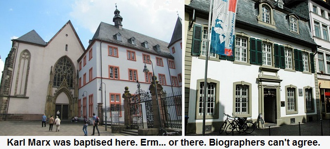 Biographers' assertions on where precisely the mass-baptism of the seven Marx children took place are contradicting. One says in the local Jesuit church in Trier (where Karl was Confirmed in 1834).6 Another states that the baptisms happened not in a church, but in a ceremony attended by a large number of friends, in the Marx family home 7, a home run by a Jewess.