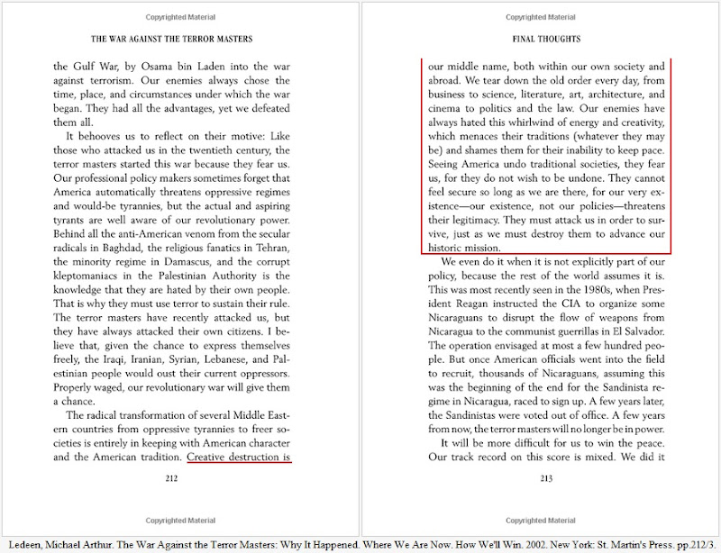 Creative destruction is our middle name, both within our own society and abroad. We tear down the old order every day, from business to science, literature, art, architecture, and cinema to politics and the law. Our enemies have always hated this whirlwind of energy and creativity, which menaces their traditions (whatever they may be) and shames them for their inability to keep pace. Seeing America undo traditional societies, they fear us, for they do not wish to be undone. They cannot feel secure so long as we are there, for our very existence—our existence, not our politics—threatens their legitimacy. They must attack us in order to survive, just as we must destroy them to advance our historic mission.