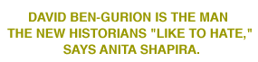 Segev's main target is none other than the lion of Zionism, Israel's founding father par excellence, David Ben-Gurion. Born in 1886 in Plonsk (then Russian Poland), Ben-Gurion founded his own Zionist youth group at age fourteen. Six years later, he settled in Palestine, where he soon became a pioneer of the Jewish Labor movement and an indefatigable champion of the Jewish struggle for independence. For classical secular Zionists, Ben-Gurion was a modern-day Moses; no single individual embodied the spirit and aspirations of the movement quite as plainly. And to the New Historians, there is no one more representative of Zionists' myopic devotion to their cause. "Ben-Gurion is somebody they like to hate," charges Anita Shapira, a professor of Jewish history at Tel Aviv University and a leading contemporary historian of Labor Zionism. "If they undermine his moral standing, his integrity, his motivation, then they are on their way to undermining the whole idea of Israel."