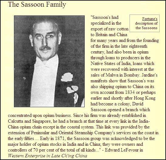 关于这一事件的报纸和电视报道铺天盖地,但从未提到英国一开始是如何控制香港的。 真相就在号称“远东的罗斯柴尔德”的大卫·沙逊的家族谱系之中,就在他们对鸦片贸易的垄断中。 英国是通过鸦片战争夺取香港的,鸦片战争给了沙逊以鸦片毒害中国的独家权利。 大卫·沙逊1792年生于伊拉克巴格达。他的父亲萨利赫·沙逊(Saleh Sassoon)是一个富有的银行家, 也是巴格达总督阿赫迈德·帕夏(Ahmet Pasha)的财政总长。(他于是成为“犹太宠臣”,权倾朝野) 1829年,阿赫迈德因腐败倒台,沙逊家族于是逃到印度孟买。 孟买当时是印度内地与远东之间贸易路线上的战略要冲。 很快,英国政府就授予沙逊所有工业制造的棉纺织品、丝绸和——最最重要的——鸦片的垄断贸易权利。鸦片是当时世界上最容易上瘾的药物(毒品)。