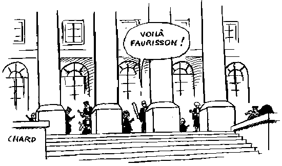 Unter der jüngsten Flut unterdrückerischer Maßnahmen gegen die Revisionisten kann man (beginnend mit Frankreich) die Entlassung Michel Adams durch das Erziehungsministerium feststellen, der Geschichtslehrer an der Mittelschule in Brittany war; er ist 57 Jahre alt, hat fünf unmündige Kinder und ist nun ohne irgendwelches Einkommen und erhält im Augenblick nicht einmal öffentliche Unterstützung. Und Vincent Reynouard, der ebenfalls von seiner Lehrtätigkeit im staatlichen Sektor entfernt wurde, war am 10. November 1998 durch ein Gericht in Saint-Nazaire zu drei Monaten Gefängnis und einer Geldstrafe von 10.000 Francs verurteilt worden, weil er das Rudolf Gutachten verteilt hatte. Reynouard ist verheiratet, 29 Jahre alt, und hat drei kleine Kinder, und er und seine Frau sind mittellos. Pastor Roger Parmentier wurde aus der Sozialistischen Partei ausgeschlossen, weil er Roger Garaudy jüngst in einem Prozeß geholfen hat, und was J.-M. Le Pen betrifft, wurde er sowohl in Frankreich als auch in Deutschland für eine harmlose Bemerkung über "das Detail" der Gaskammern angeklagt.[81]