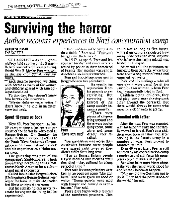 Elfjähriger überlebt sechs Vergasungen!»Als elfjähriger Häftlingsjunge wurde Moshe Peer mindestens sechsmal in die Gaskammer des Konzentrationslagers Bergen-Belsen geschickt. Er überlebte jedes Mal und beobachtete dabei mit Grauen, wie die mit ihm in die Gaskammer gebrachten Männer und Frauen um ihn herum vergast zusammenfielen und starben. Bis zum heutigen Tag weiß Peer selbst nicht, wie er die Vergasungen überleben konnte.«