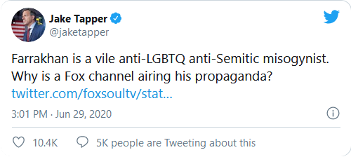 Zionist organisations never march alone. They are effective in identifying the odd Sabbos Goy who stands ready to lend his or her ‘credibility’ to the ‘cause.’ This time it was CNN anchor Jake Tapper who tweeted, “Farrakhan is a vile anti-LGBTQ anti-Semitic misogynist. Why is a Fox channel airing his propaganda?”