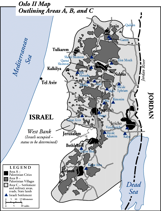 - West Bank Map According to Oslo II + Other detailed maps of Settlements/Jerusalem (Foundation for M.E. Peace)