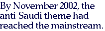 By November 2002, the anti-Saudi theme had reached the mainstream with an article in Newsweek alleging financial support for the 9/11 terrorists from the Saudi royal family, and commentary on the subject by such leading figures in the Senate as Joseph Lieberman (D-Conn.), John McCain (R-Ariz.), Charles Schumer (D-New York), and Richard Shelby (R-Ala.). [72]