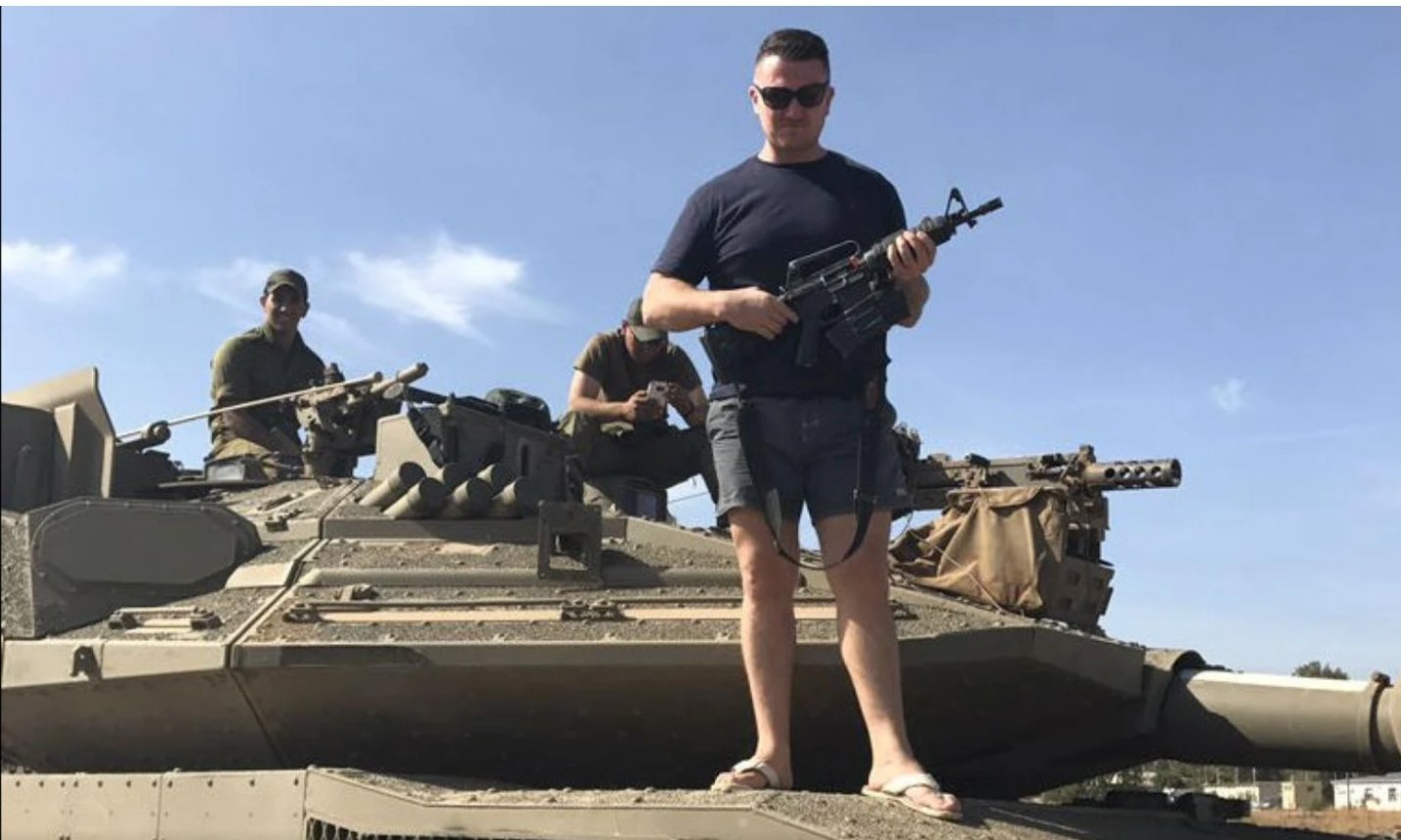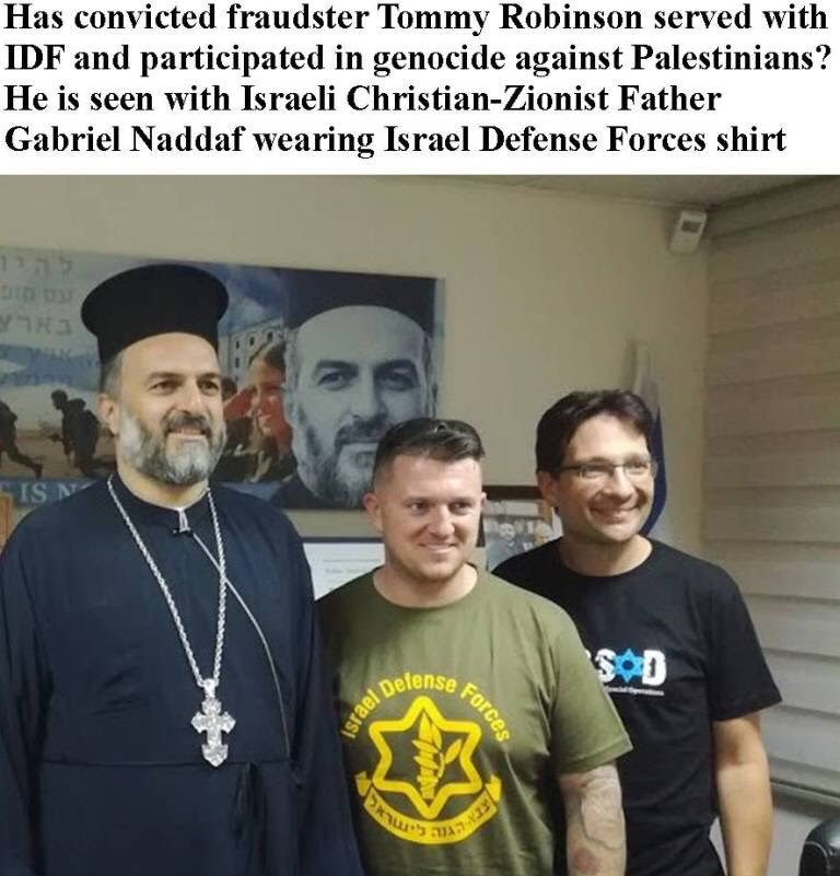 Rebel Media's Tommy Robinson's "fact finder" pictures from his Israel trip, here in IDF T-shirt with
