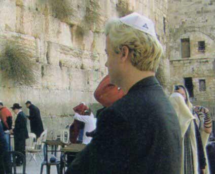Geert Wilders with a Jewish kippah on head, doing the "Wailing Wall routine"